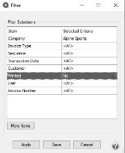 - If you would like to filter the list of invoices that display, click the Filter button, select your filter criteria, and either Apply the filter to the list (you will see Custom in the Filter box) or Save the filter so you can select the named filter in the Filter box in the future. In the example below, the filter is set to display invoices that aren't printed and the filter was saved with the name Not Printed - Alpine Sports.