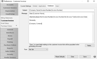 If you'd like to use the same email Subject, and Message, and Form each time you email an invoice, it can be added to this preference. This preference also allows you to add Form Fields from the customer invoice data to the default Subject line or Message text.