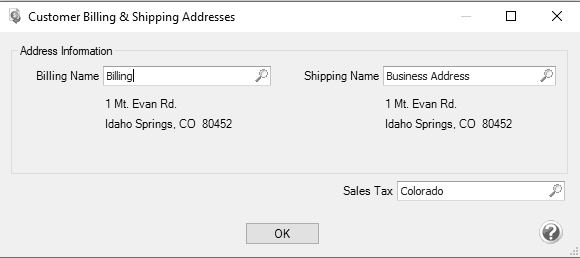1. To view or change the customer's Billing Name/Address, Shipping Name/Address, or Sales Tax, click the Address icon to display the Customer Billing & Shipping Addresses screen.