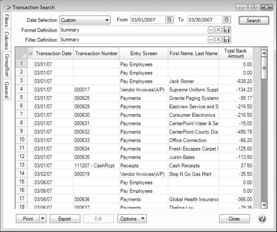 - Click Search. The transactions that meet the selection criteria specified in step 2 will display.