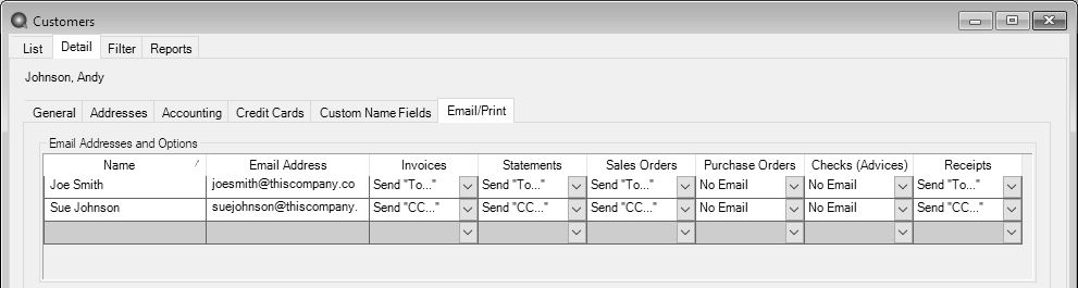 You can optionally add email addresses where messages and attached documents can be sent to; including internal staff, outside accountants, or other addresses that are not related to the name/customer the transaction is entered for. You can also select how each email is to be sent, directly to the recipient, as a carbon copy, or as a blind carbon copy or set a default "From" email address for each document.