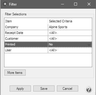 - If you would like to filter the list of receipts that display, click the Filter button, select your filter criteria, and either Apply the filter to the list (you will see Custom in the Filter box) or Save the filter so you can select the named filter in the Filter box in the future. In the example below, the filter is set to display receipts that aren't printed and the MadCap:mediastyle="@media print { width: 350px;max-width: 350px; }" style="width: 350px;max-width: 350px;" />filter was saved with the name Not Printed - Alpine Sports.