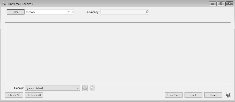 - Click Email/Print to email and or print the selected receipts. Receipts will be emailed and/or printed according to the email/print settings on the customer. Click Print to print a copy of all selected receipts.