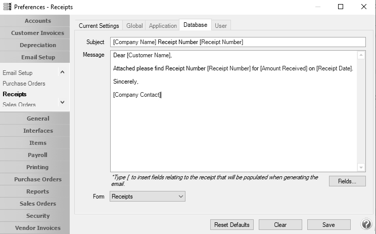 If you'd like to use the same email Subject, and Message, and Form each time you email a receipt, it can be added to this preference. This preference also allows you to add Form Fields from the receipt data to the default Subject line or Message text.