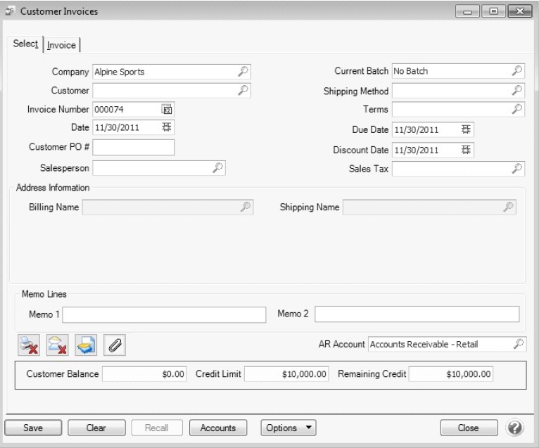 1. Enter the Customer by typing in a portion of the customer’s name or abbreviation or click on the lookup button to display a list of your existing customers. Once the customer is selected, the Shipping Method(if a shipping method isn't assigned for this customer, it will display from the default set in File > Preferences > Customer Invoices> Defaults), Salesperson, Terms, Due Date, and Discount Date, Sales Tax and Accounts Receivable fields will be populated automatically from the information assigned to the customer.