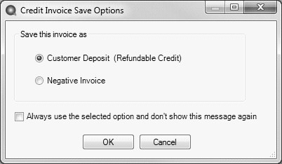 • Always Show me the Save Options - When a negative customer invoice is entered and you click Save, the Credit Invoice Save Options screen will always display for you to determine if you want the negative invoice saved as a Customer Deposit (Refundable Credit) that posts to Customer Deposits instead of an Accounts Receivable account or Negative Invoice that posts to your Accounts Receivable account. You also have the opportunity to save your selection as your preference in File > Preferences > Customer Invoices and not display this screen again.