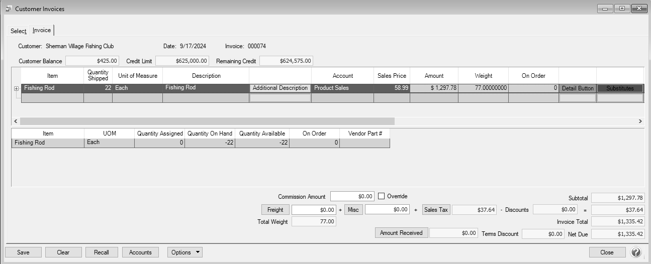 6. Continue entering additional lines on the Invoice for each item that is sold to or returned by this customer.