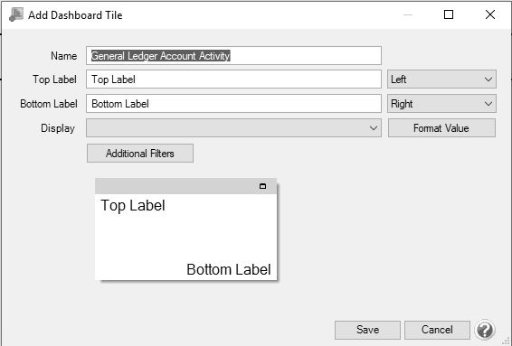 - In the Bottom Label box, enter the text you want to display in the lower right corner of the Dashboard tile. For example, From Account 700000. Then, select if you want the text to display from the Left, in the Center, or from the Right side of the Dashboard tile.