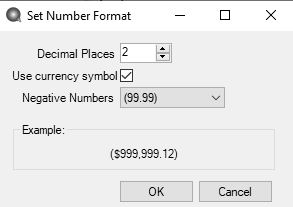 - In the Decimal Places box, select the number of decimal places you want to view, select the Use currency symbol check box to add a $ sign to totals, determine if Negative Numbers should display with a negative sign or in parenthesis, and then click OK.