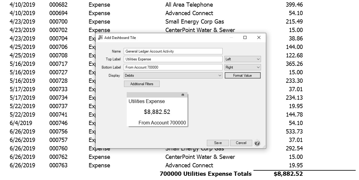 - In the Top Label box, enter the text you want to display in the upper portion of the Dashboard tile. For example, Utilities Expense. Then, select if you want the text to display from the left, in the center, or from the right side of the tile.