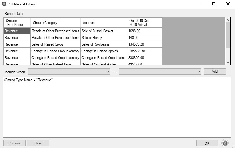 - Click Additional Filters to select the specifics that you want to appear on the Report Tile. In this example, the total of the Revenue subset of accounts should be displayed.
