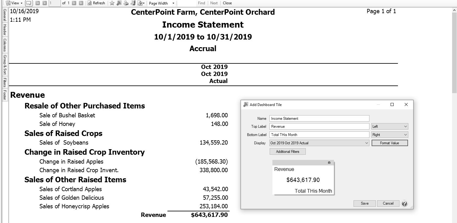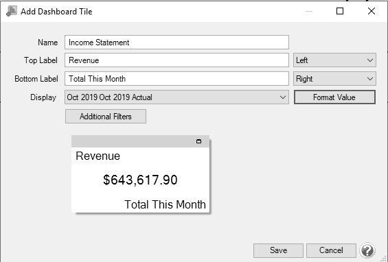 - In the Display box, specific information about the data the report displays will need to be defined so the Dashboard tile can display the information you want to view. For example, for the Income Statement report the selection period was selected to display This Month. In this example, the information viewed will be for October 2019 Actual.