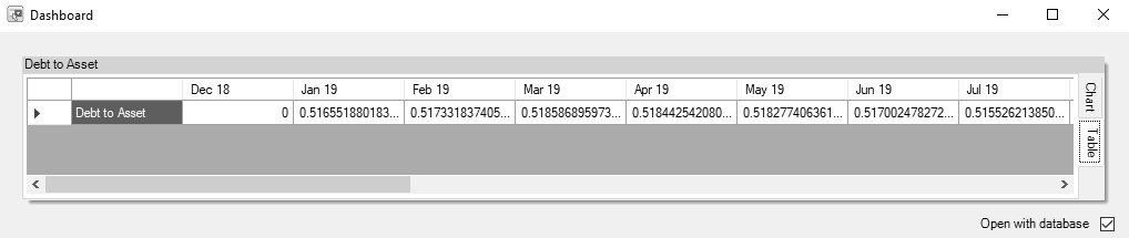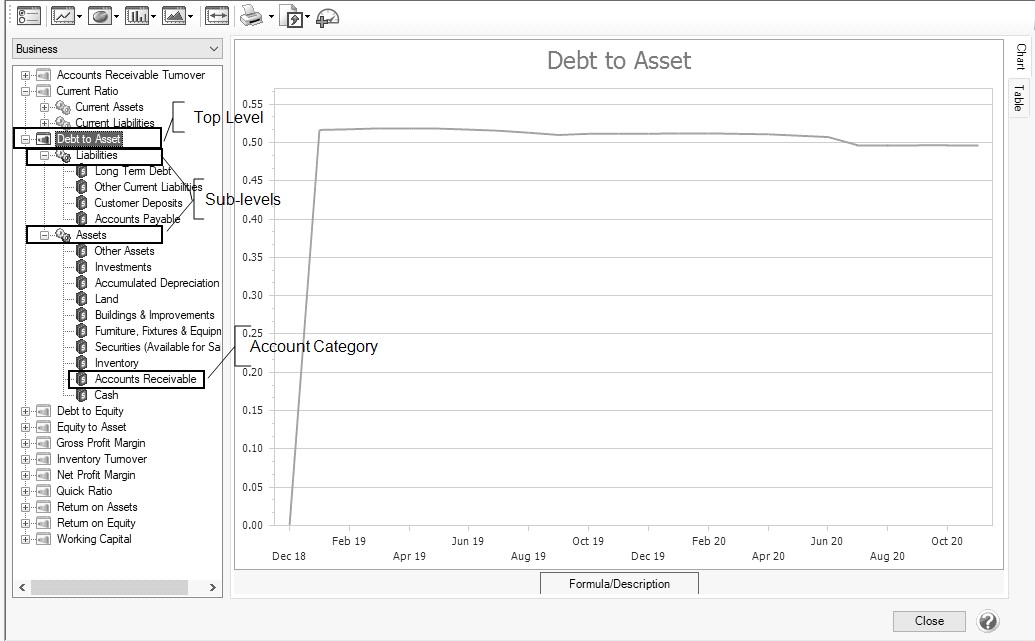 - On the left side of the screen, select the top-level of the tree, sub-level, or account cateogory of the tree (not the individual ratios), in the example below the top level is Debt to Asset, the sub-levels are Liabilities and Assets, and the account category level is Accounts Receivable..
