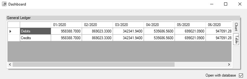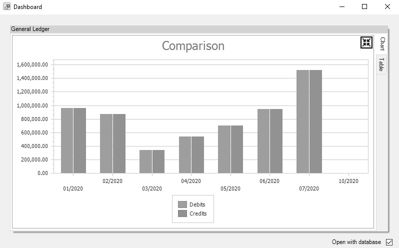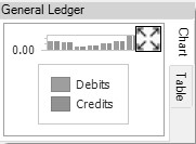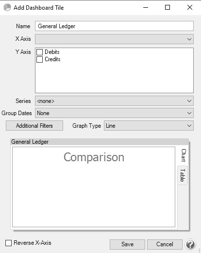 . In the examples below, the Add Dashboard Tile screen was defined from the General Ledger report, X Axis set to (Group) Account, Y Axis set to both Debits and Credits, Series set to None, Group Dates set to Month, and Graph Type set to Bar. To collapse the Chart/Table , click