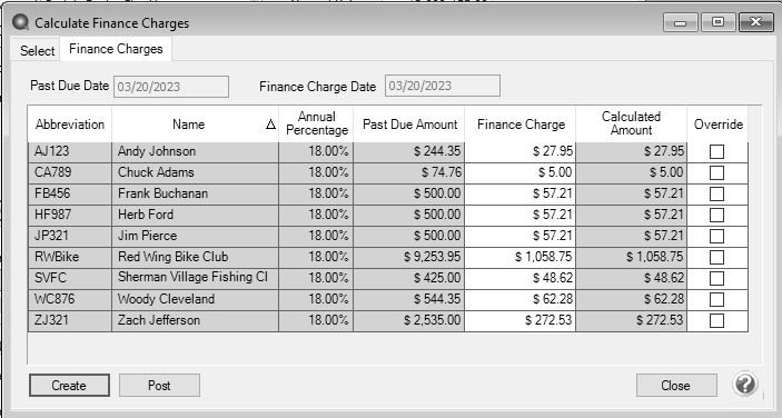 If a calculated finance charge is overridden and changed to 0.00, a finance charge transaction will not be created when finance charges are posted.