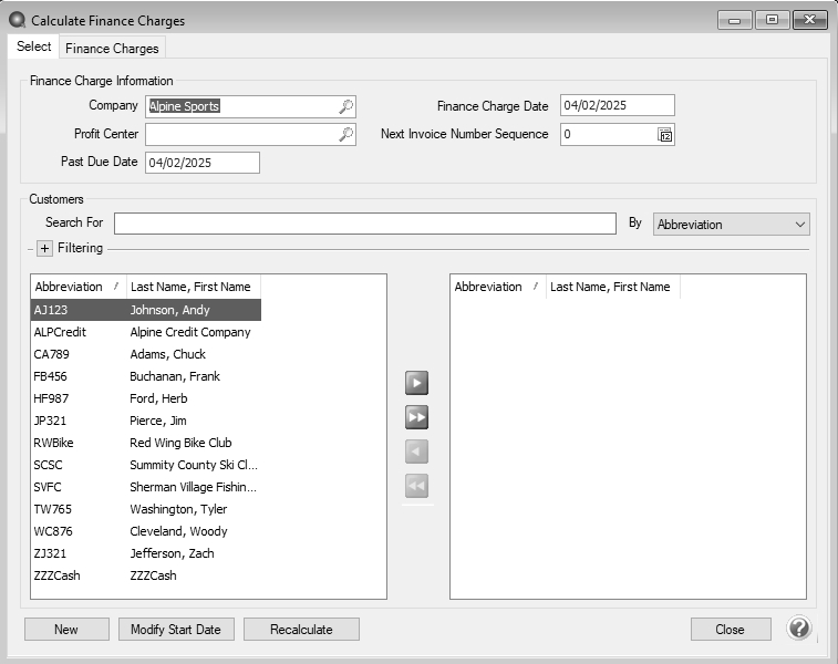 6. Move the customers you want to calculate finance charges for from the left list to the right list. If you click the double-right arrow, all customers will be selected for calculation. Normally one will move all customers to the right. Those customers that don't have past due invoices or not setup to calculate finance charges, will be ignored in the calculation process.