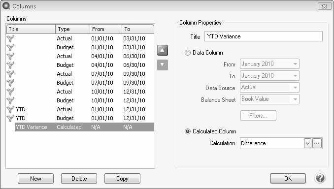 2. Select the New button to add a new column that displays either actual (book values), budget numbers or a calculated amount.