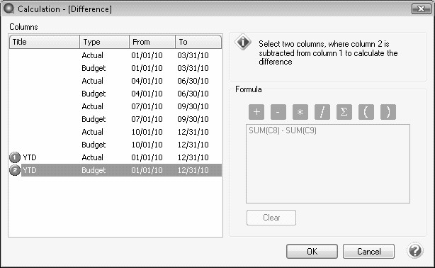 Columns can be added to an analysis that are calculations instead of amounts from actual transactions or budgets. For example, if you wanted a column that showed you the difference between the budget and actual amounts. The calculations can involve amounts or percentages.