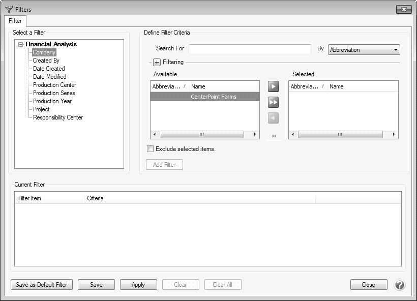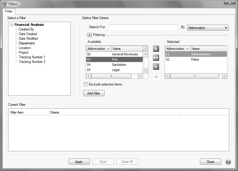 By default all data is included in a financial analysis. The data can be filtered to include information for a specific area of your business. Data can be filtered by Departmentor Project.