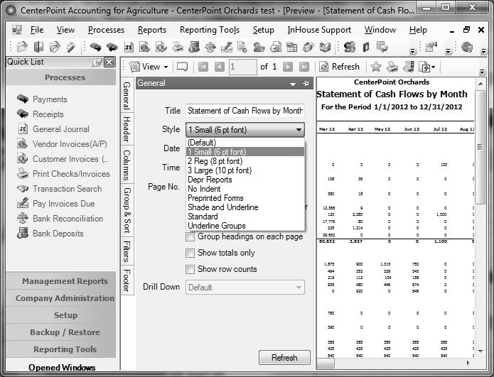 Occasionally, when reports are modified, too many columns of data are added and the report no longer fits on one page. New report styles allow you to select a smaller font. Using the smaller font gives you the ability to make the column width smaller and the result is more columns fitting on the page width. Smaller column widths can also help convert a landscape report to portrait.