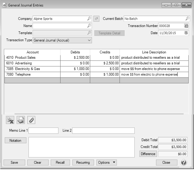 Note: The Difference button will work only if you have not selected the Use Template, Offset to Account, or Auto-Reversing Entry option.