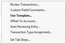 • If you need to select a template to use on a general journal entry, select Options > Use Template and a new Template field will be displayed at the top of the General Journal Entry screen.