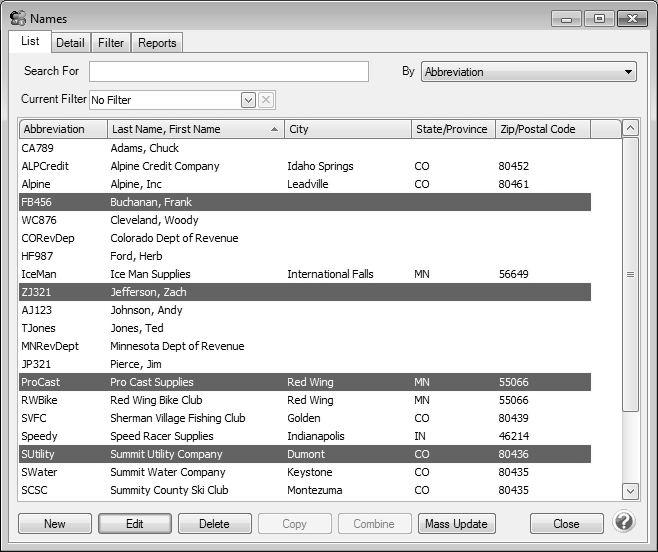 2. From the List tab, select the names, vendors, or customers you want to update. Multiple names can be selecting by pressing the CTRL key while you make your selections. If you do not limit your list to selected names, all names will be included in the update.