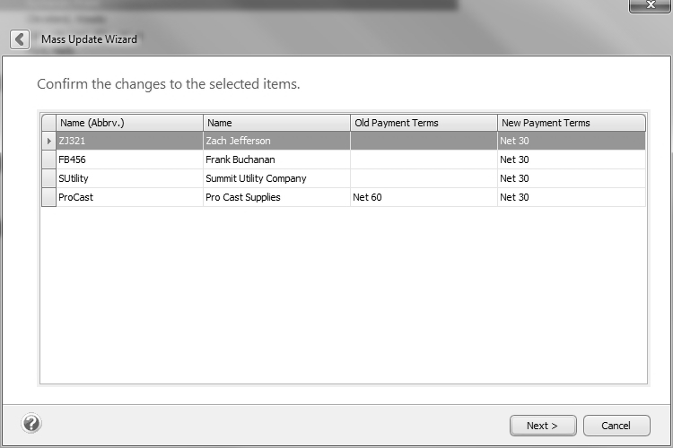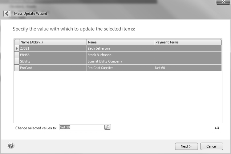 2. A list of all customers or vendors that have the specified information assigned will be displayed. Specify the value with which to update the selected items. For example, if you chose Payment Terms, specify the terms you'd like assigned to each of the selected vendors. Click Next.