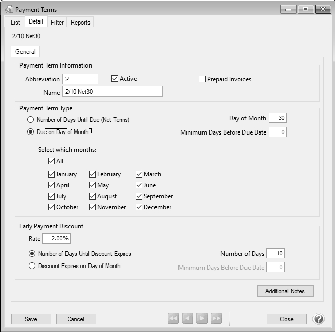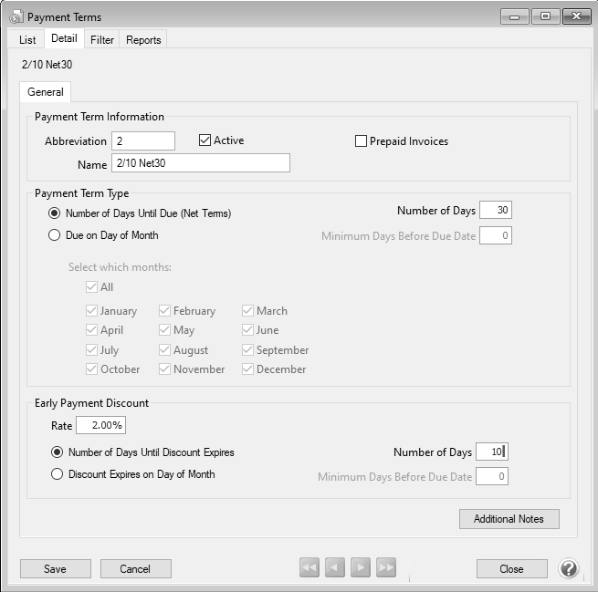 9. Click Save to save the payment term and return to the List tab, or click Close to save the payment term and close the Payment Terms screen.