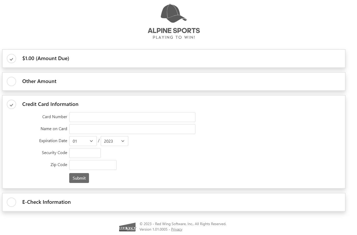 - Click Pay, select the method of payment: Credit Card Information or E-Check Information (this payment option is available only if the Merchant ID is configured with Fiserv to accept e-check (ACH) payments), enter your credit card or bank account information, and then click Submit.