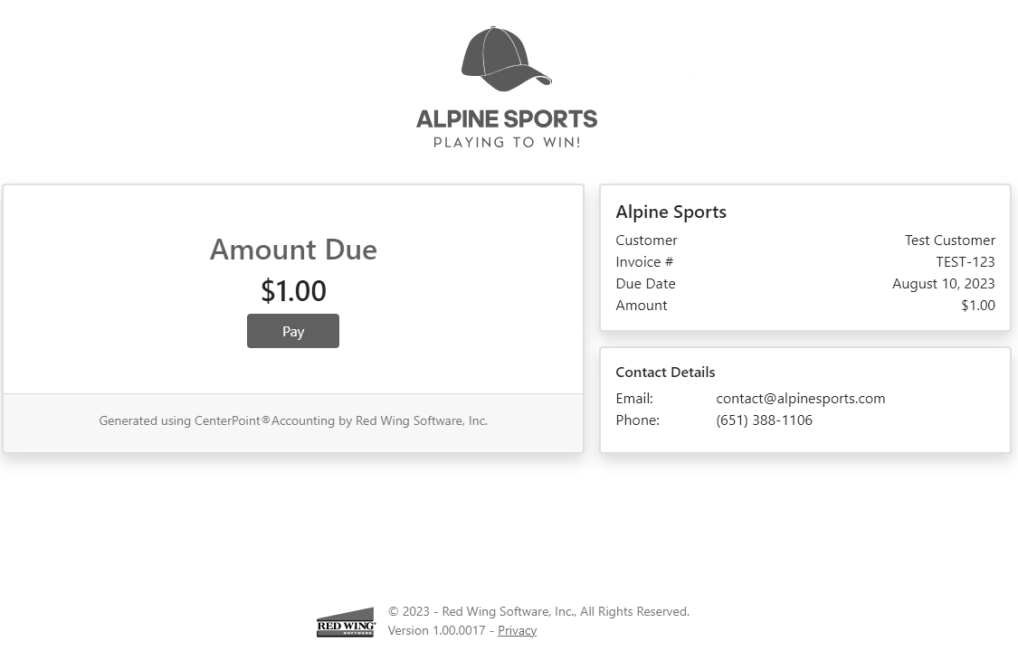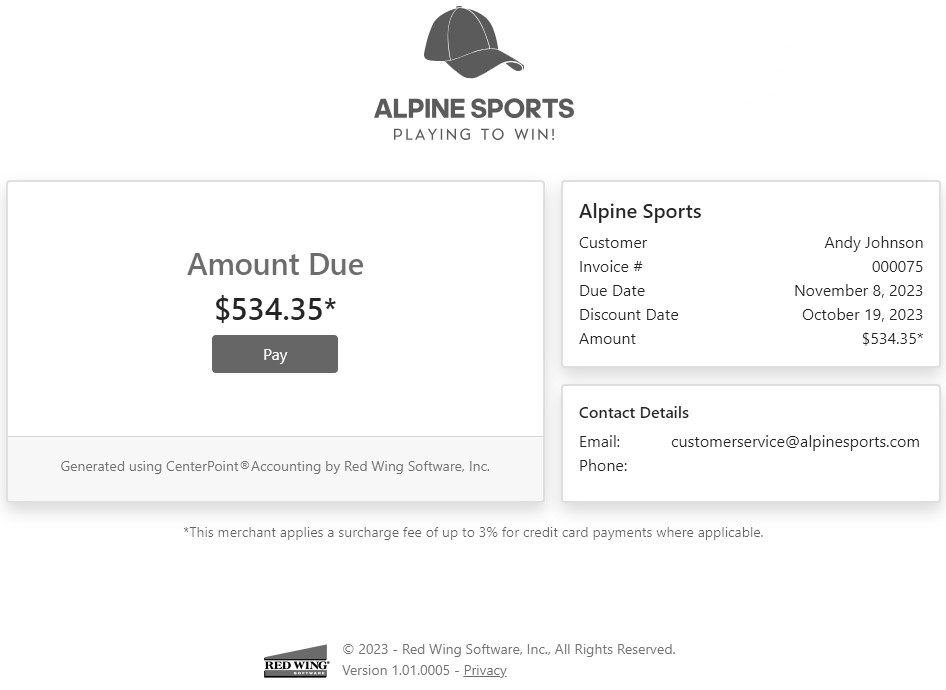 The Customer Payments Portal allows you to accept credit card or e-check (ACH) payments online from your customers. Red Wing Software joined forces with Fiserv, a premier integrated payments solution provider, to offer seamless payment processing within CenterPoint Accounting. The Customer Payments Portal works with the invoice emailing feature in CenterPoint. When customers receive their invoice or statement, the email will contain a link to a unique Invoices Due web page where they can pay outstanding invoices online. Those payments are then imported into CenterPoint as receipts applied to the invoices.