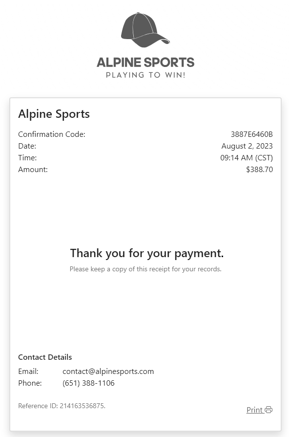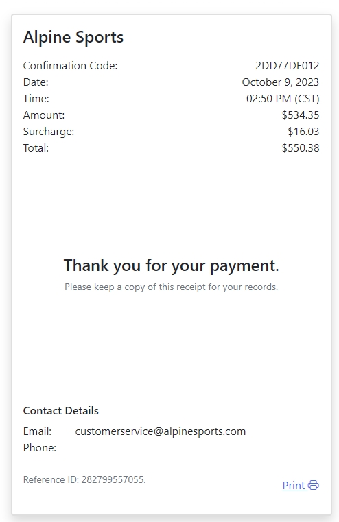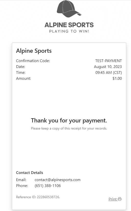 If the test payment is approved, a receipt will display for your records.