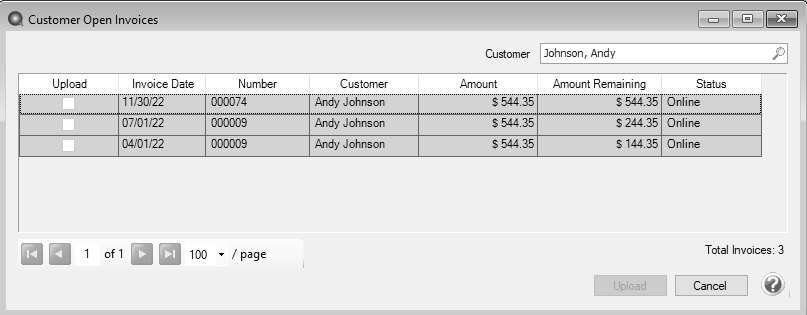If an invoice has a status of Offline or Not Synched, select the Upload check box and then click the Upload button to upload the invoice to the Customer Payments Portal (invoices can only be uploaded if the customer is configured to receive emails for customer invoices).