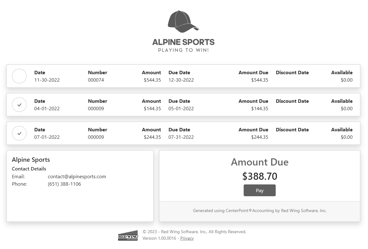 Customers can choose to pay the full amount due, or if they have multiple invoices, click the View Details to see the individual invoices. They can unselect any invoices they do not wish to pay at this time and click Pay to pay the selected invoices.