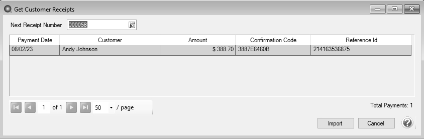 - The available online payments for the registered database will display. Click Import to generate receipts for all available online payments.