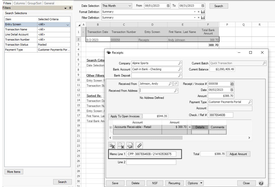 The receipts will come into CenterPoint as “Receipt” transactions, just as if they were entered into CenterPoint directly. They are visible in Transaction Search and on any reports where you would normally review receipts. In addition, receipts from the Customer Payments Portal have a Payment Type of Customer Payments Portal, and Memo Line 1 will contain a CPP label followed by the Confirmation Code/Reference Id of the online payment.