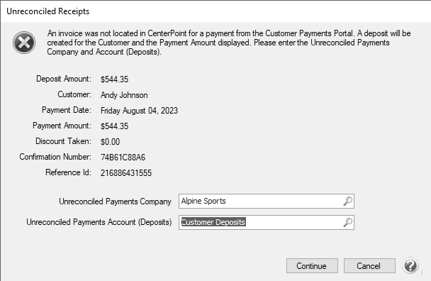 A: In the rare occurrence that a payment made on the Customer Payments Portal cannot be matched with an open invoice in CenterPoint (for instance, the payment was made online, and then a receipt was entered in CenterPoint before the online payment was imported) CenterPoint will prompt you that it needs to create a customer deposit for this payment.