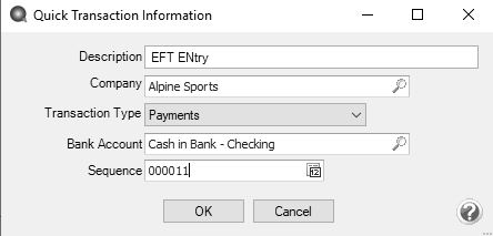 Quick transaction entry can be used to enter transactions that represent common entries where the only values that change are amounts, transaction number, and transaction dates. The common entries are set once on the Quick Transaction Information screen. Once the common entries are set, an unposted transaction batch is created (The batch comment is taken from the Description field on this Quick Transaction Information screen, the batch date is taken from the system date, and the batch user from the currently logged in user.) and the quick transaction grid displays.