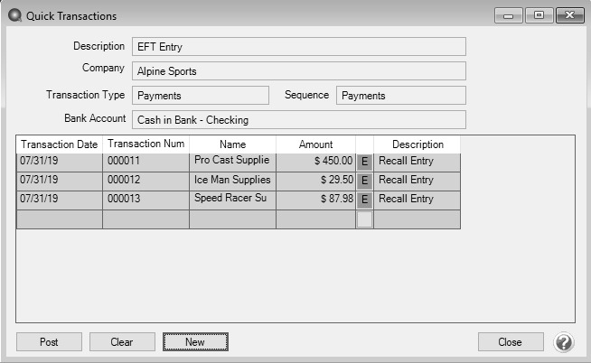 This Quick Transactions feature in CenterPoint provides a means of entering multiple transactions in the same screen and posting them all at once. Only one transaction type can be entered at the same time, for example Payments, Receipts, or Vendor Invoices. This option can be useful in environments with heavy data entry oriented such as a Service Bureau, or can be used for entering a group of transactions such as the monthly EFTs from your bank statement.