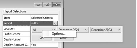 - Under Report Selections, select the date/period selection you want to customize. In the example below, Period was selected.