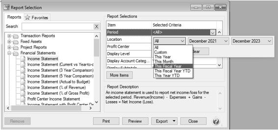- Select the report you want to print/preview. In the example below, the Income Statement report was selected.
