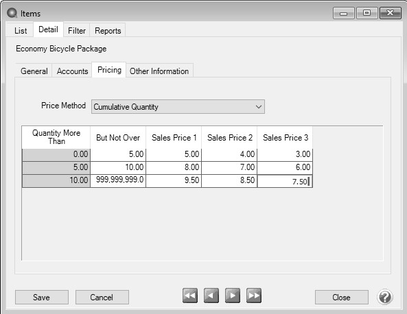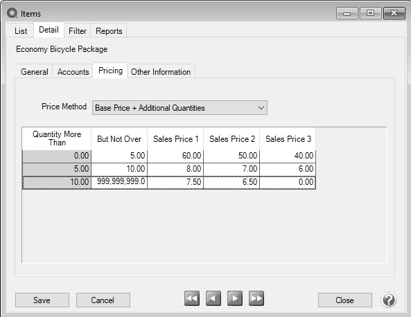 - Fixed Pricing with Qty Breaks - This pricing method can be applied to inventory item types. Enter the selling price for this sales item with the quantity break information for each Sales Price Level.