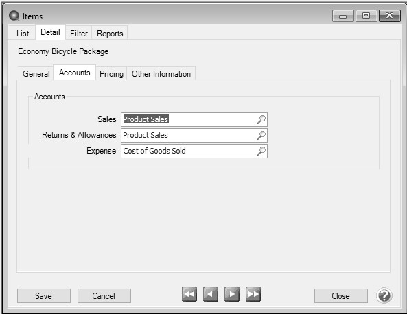 - Sales - This account is credited when this sales item is sold on a customer invoice. This account is also debited when this sales item is returned on a customer invoice (credit memo).