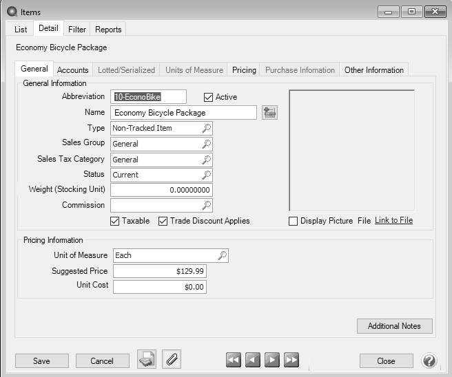 - If you linked to an image file (.bmp, .gif, .jpg, .png, or .tif) in the previous step, select the Display Photo check box to display the image in the Sales Items screen.