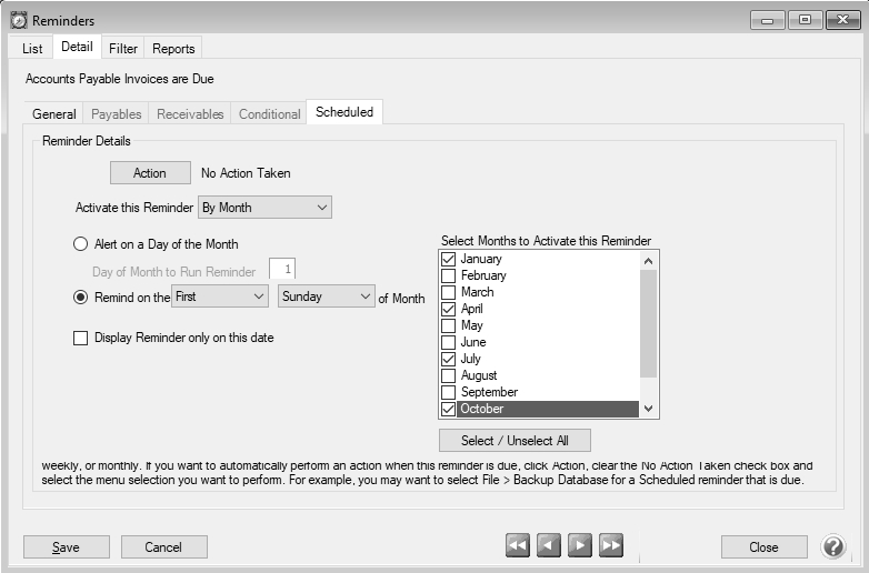 Scheduled reminders can be activated once, daily, weekly, or monthly. For example, if you'd like the system to remind you to post a recurring batch of automatic withdrawal transactions, you would set that reminder up as a scheduled reminder on the date they are withdrawn. The Scheduled Reminder can be set to automatically perform an action when a reminder is due.