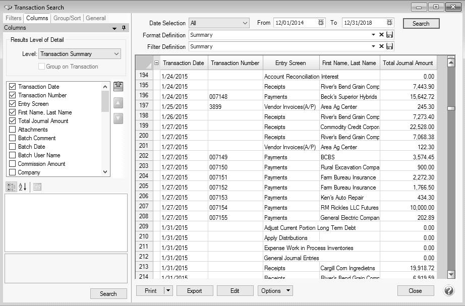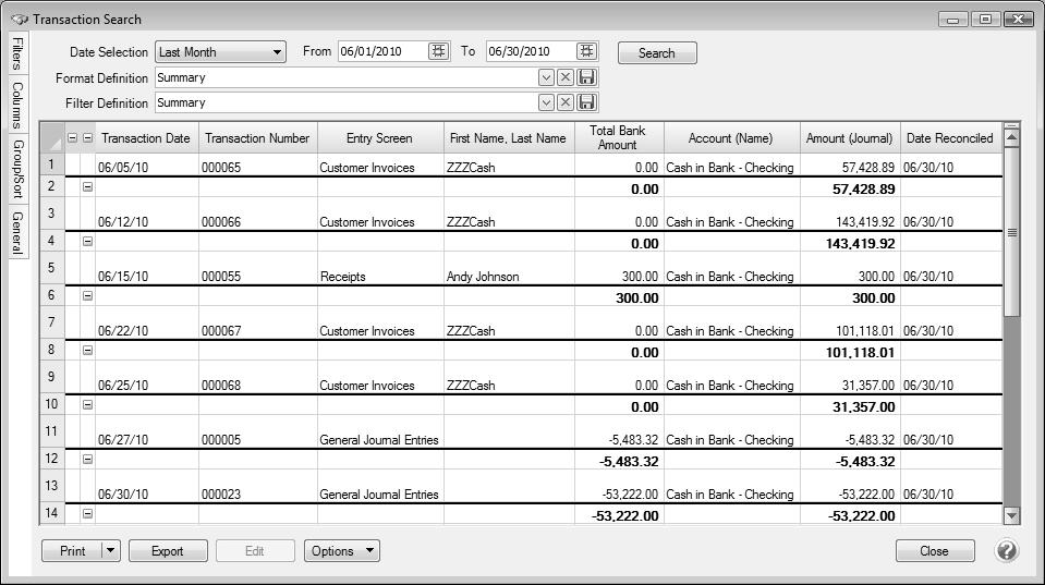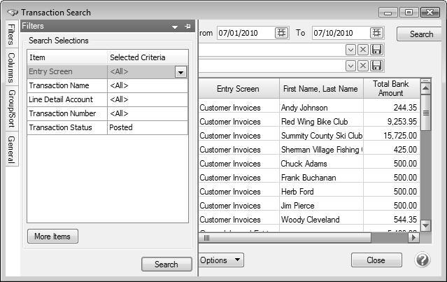 Transaction Search screen is similar to the report preview screen in that it has a Filters, Column, Group/Sort and General tabs that allow you to modify the information included. The difference being that the transaction search gives you many more choices of data (columns) & level of details to include. In this topic we'll show you the general steps one would use to execute a search. Please refer to the  Edit or Delete a Transaction and Reprint a Check, Invoice or Deposit Slip topics for specific instructions on how to use transaction search for those types of processes. Once the data is displayed in the transaction search it can be edited, deleted or printed.