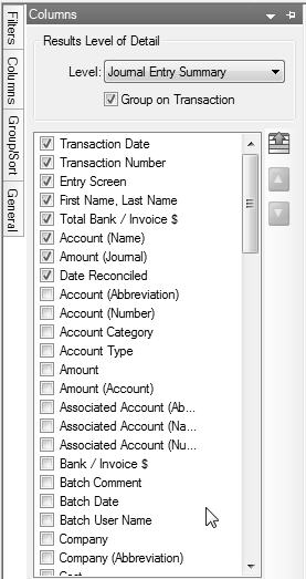 2. Click on the Columns tab. Change the Level field to Journal Entry Summary. Put a check mark in Group on Transaction. Select the fields shown below:
