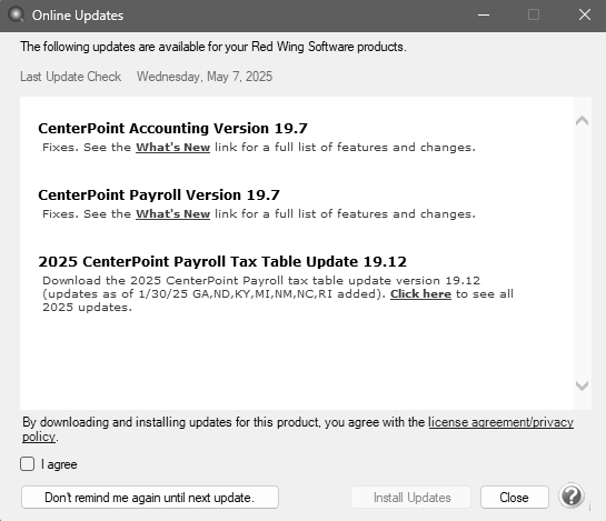 New releases of the program are available for download from our website and can be accessed from the CenterPoint program. You must own a Red Wing Software Customer Care Membership to download program updates and be connected to the internet to check for updates.