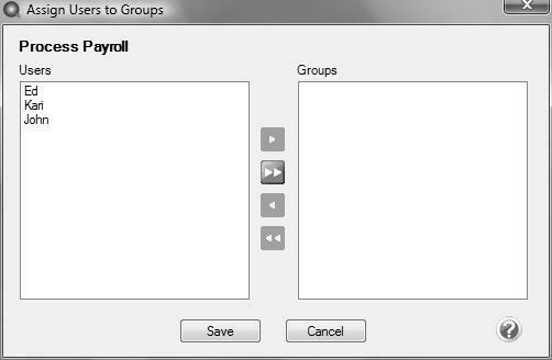 1. In the Assign Users to Groups screen, select the users that will have access to the functions for this group and click the right-arrow icon to move the users from the left-side of the screen to the right-side of the screen. Multiple users can be selected by holding the Ctrl key at the same time a user is selected.