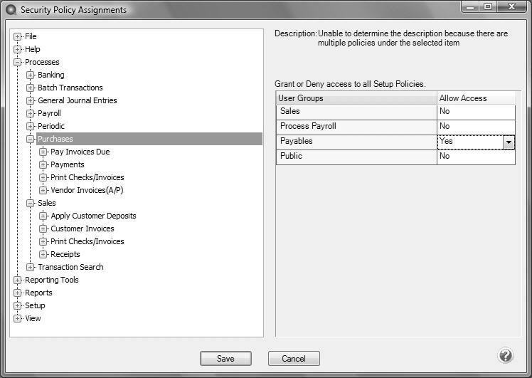 1. Some menu groups allow you to specify add/delete/edit/view/void, etc. security policies. For ALL User Groups on the right-side of the Security Policy Assignment screen, under Allow Access select Yes to grant access or select No to deny access.